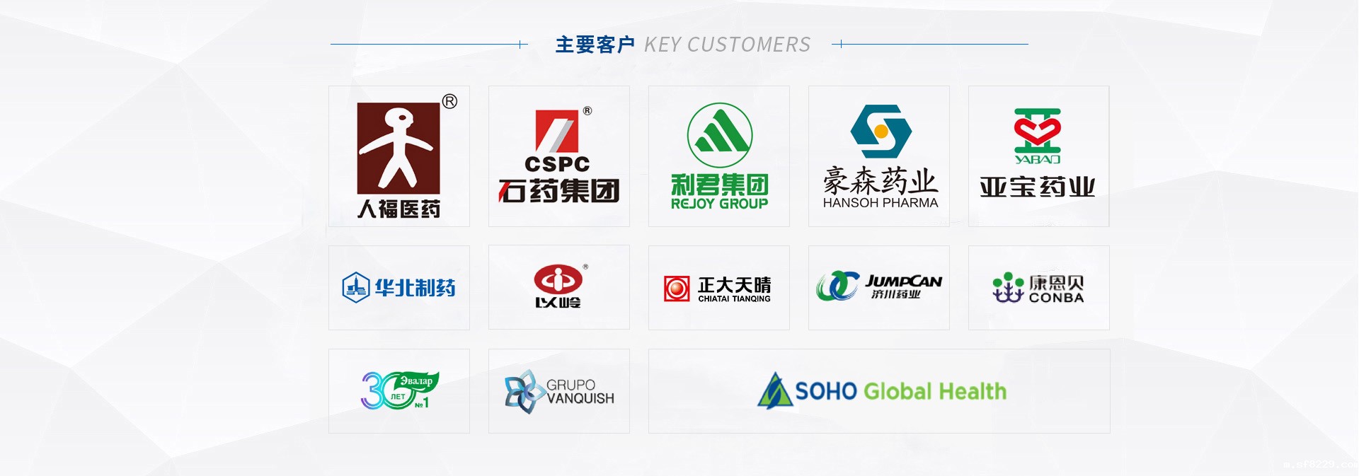 我们的客户:华药集团 | 石药集团 | 九州药业 | 以岭药业 | 正大天晴 |武汉人福 | 西安利君 | 山西亚宝 | 济川药业 | 中山达安基因 | 恒升医学 | 九州通 | 康恩贝 |四环药业 |豪森药业 | 哈药集团 | 东北制药 | 武汉麦鑫利